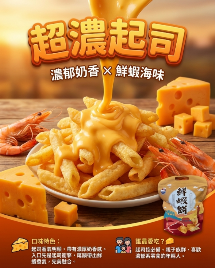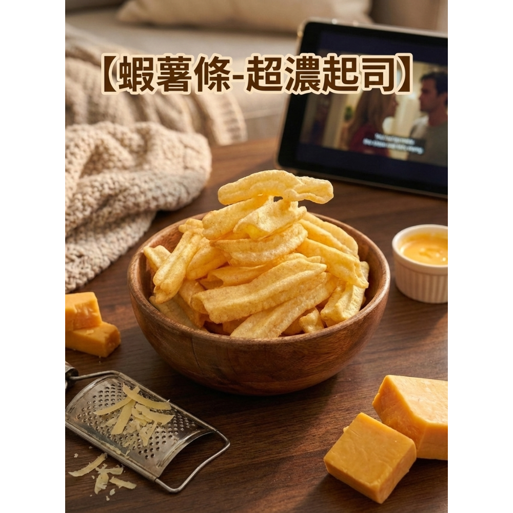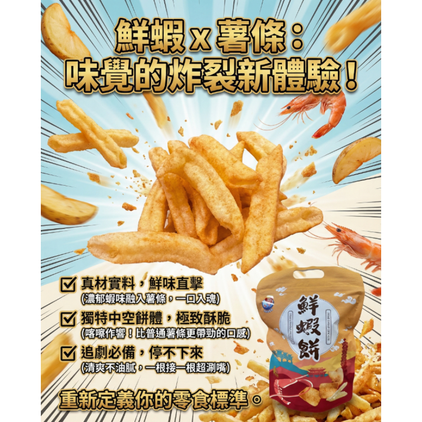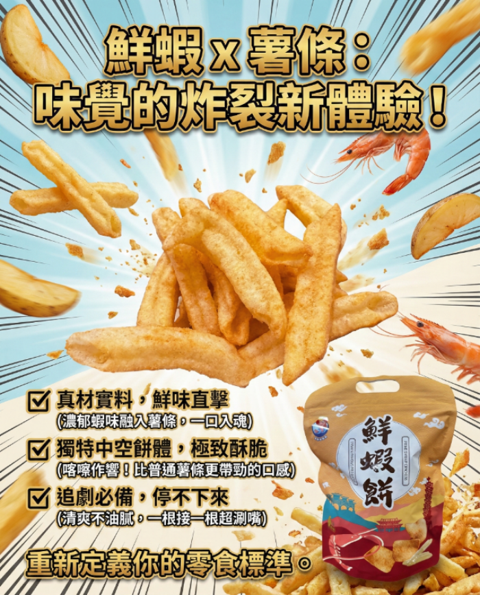 厭倦了空氣感太重、吃完只剩粉味的零食嗎? 我們將鮮蝦美味融入酥脆薯條中,獨特的**「條狀設計」**,讓口感比薄片更紮實、香氣更集中!